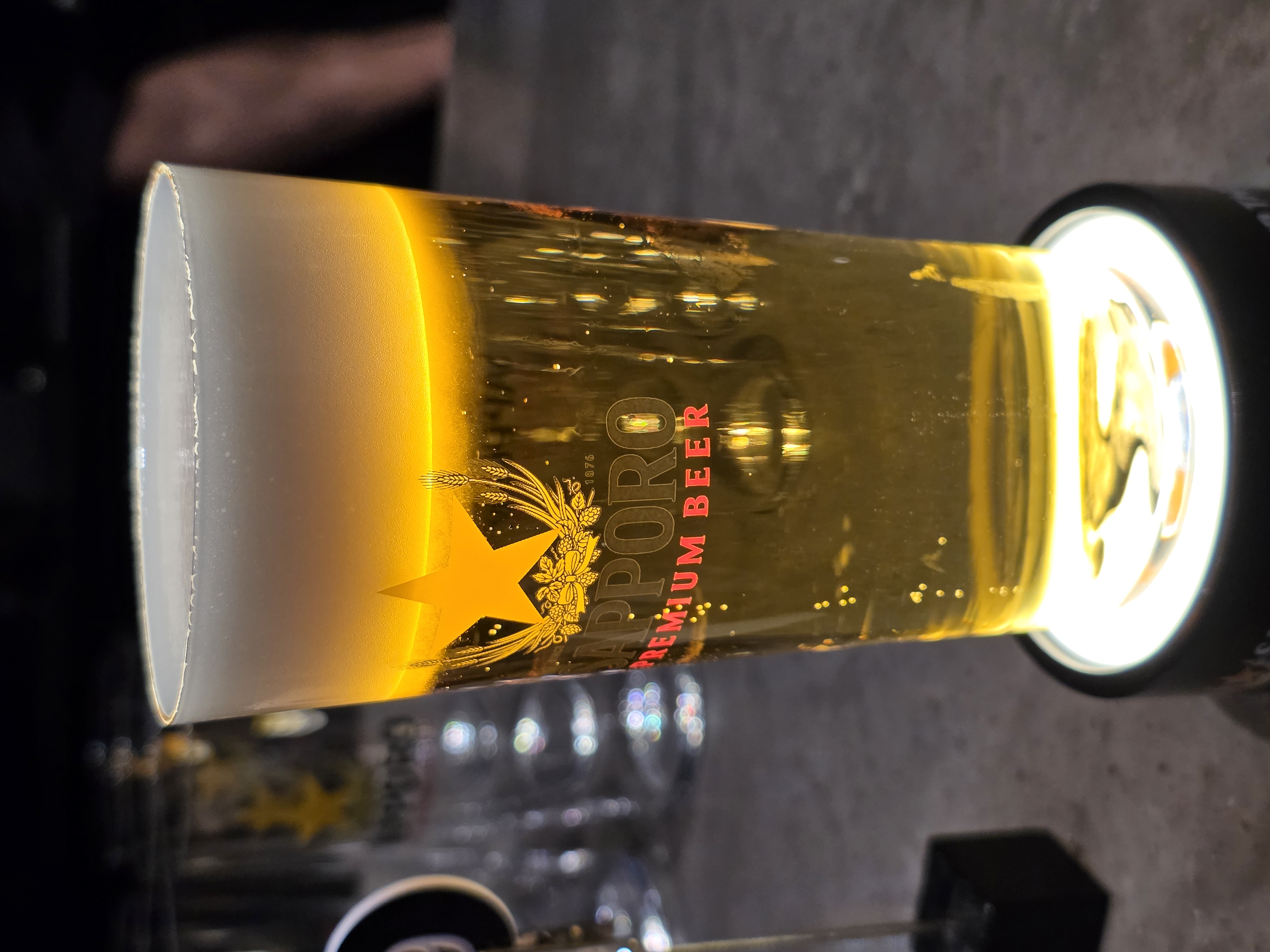 3C를 철저하게 지켜 만들어진 삿포로 프리미엄 생맥주를 받아보았다. 첫 잔은 이렇게 라이트 위에 올려 기포가 올라가는 모양이나 거품의 두께와 모양을 더욱 잘 볼 수 있게 해 주는데 온도에 민감하기 때문에 사진만 촬영한 후 곧바로 잔을 내려놓았다.